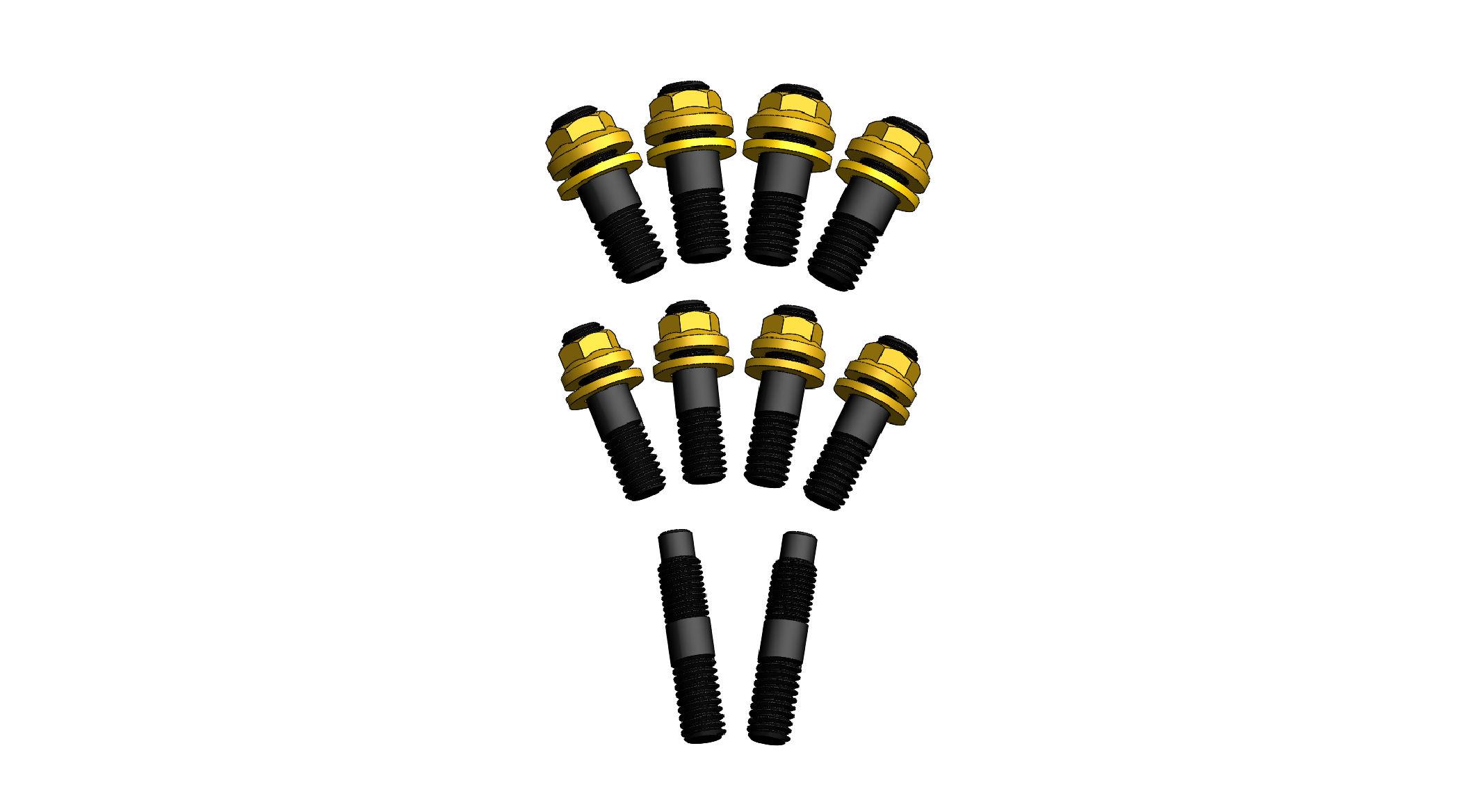 This BAE stud kit contains four course/fine 3/8" studs, washers and nuts, four course/fine 5/16" studs, washers and nuts, and two oil pan studs.