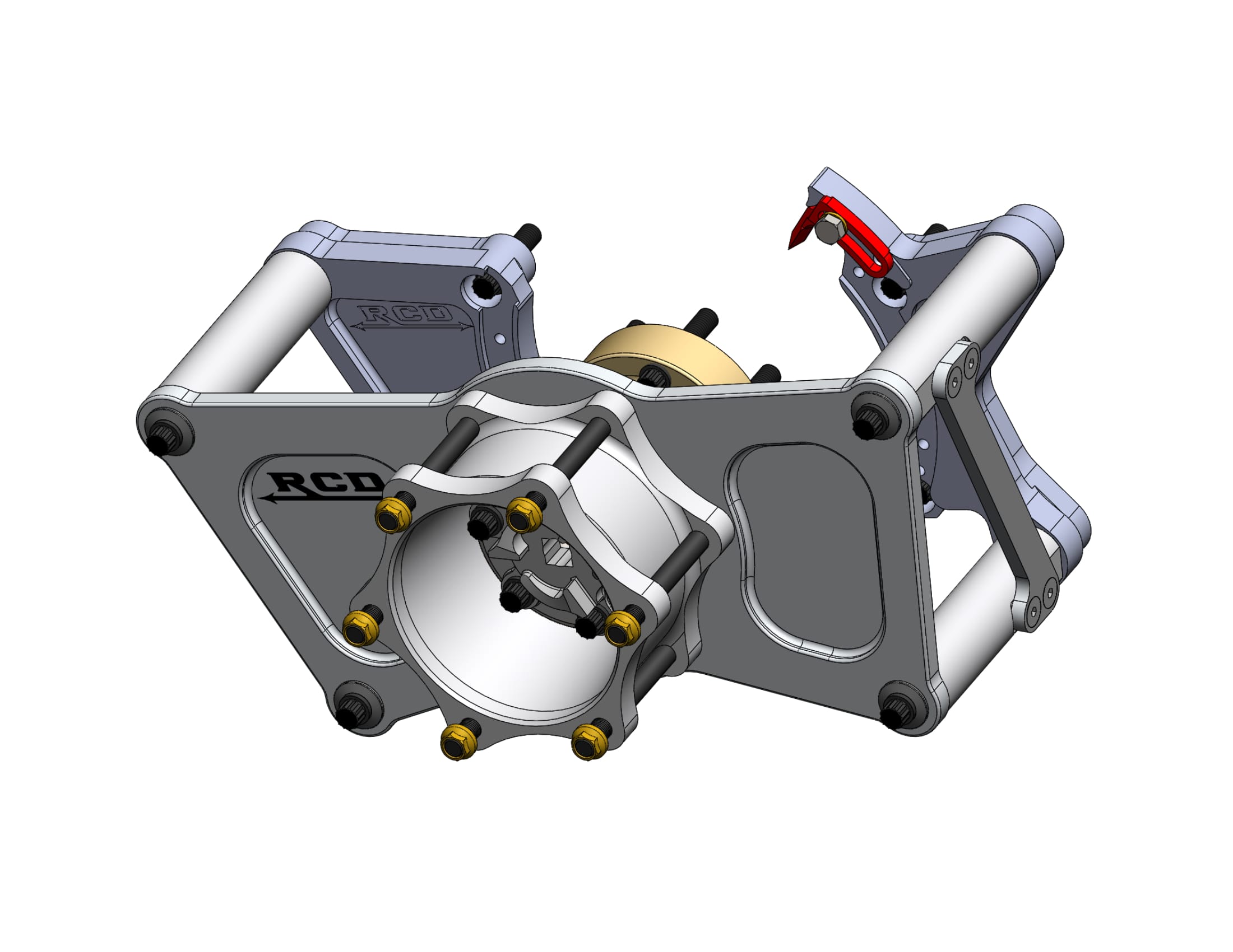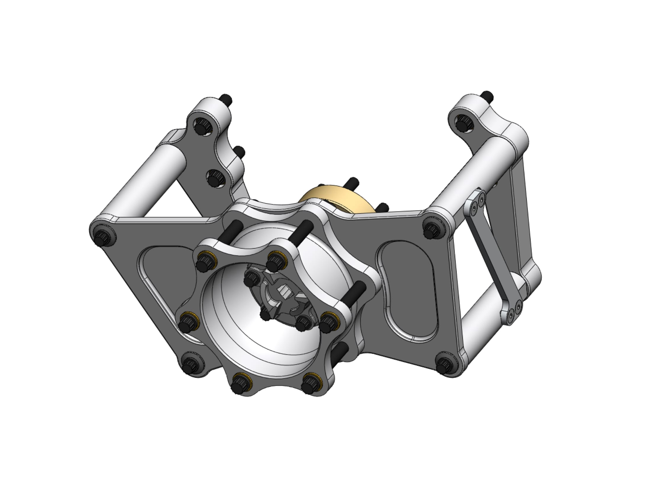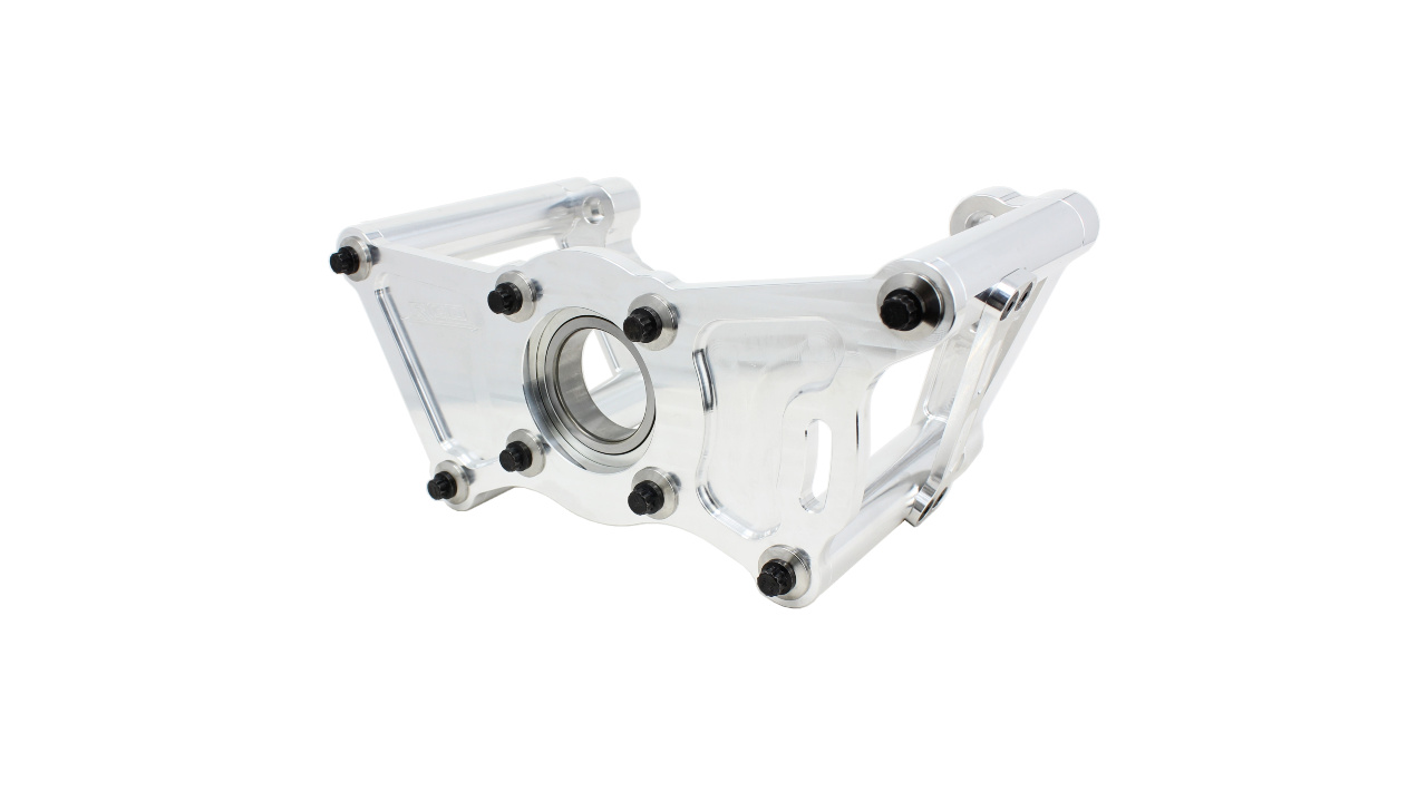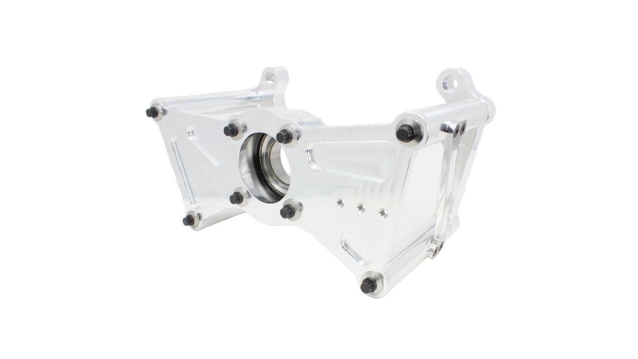 This crank support assembly is for a TFX engine block and incorporates a 6" flange crank mount starter. The struts on this assembly are setup to run crank trigger pickups.