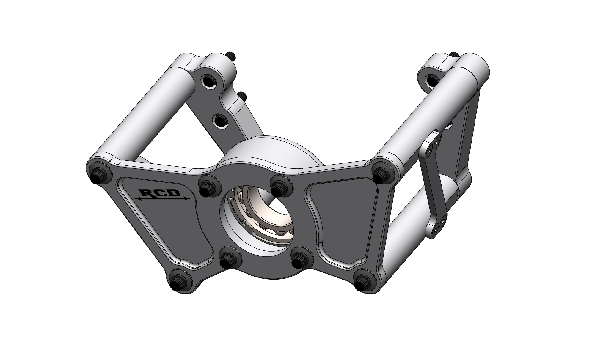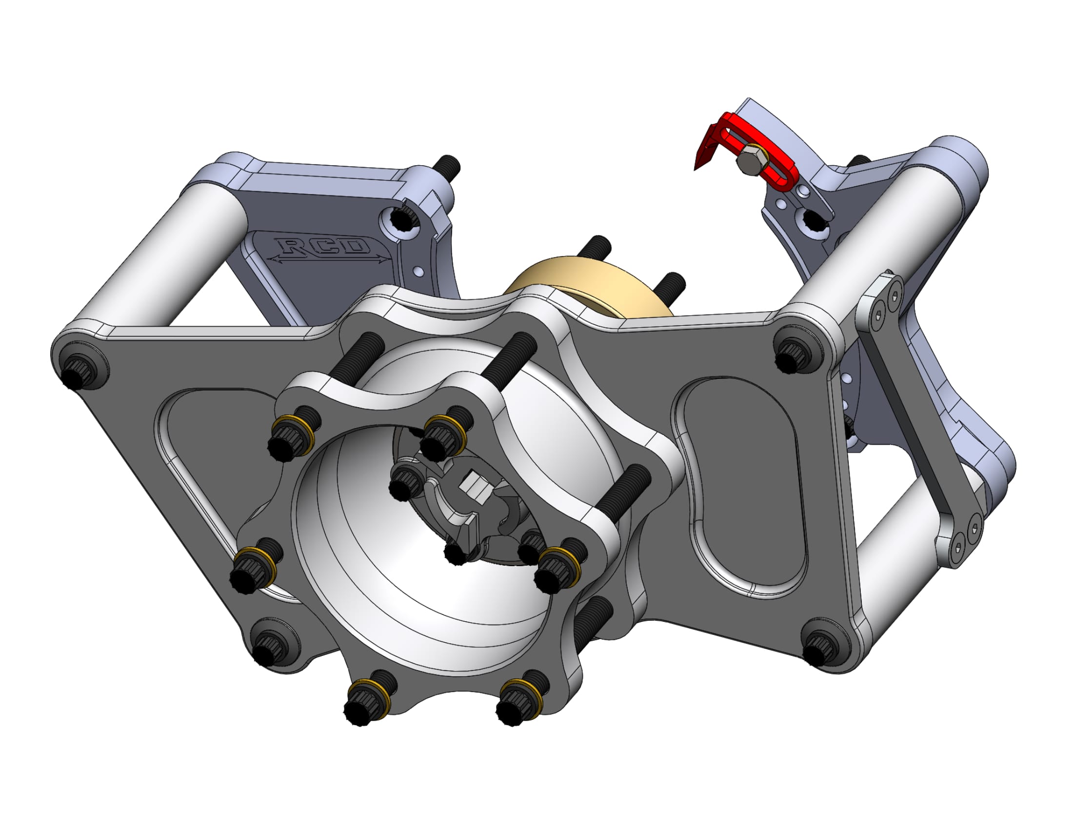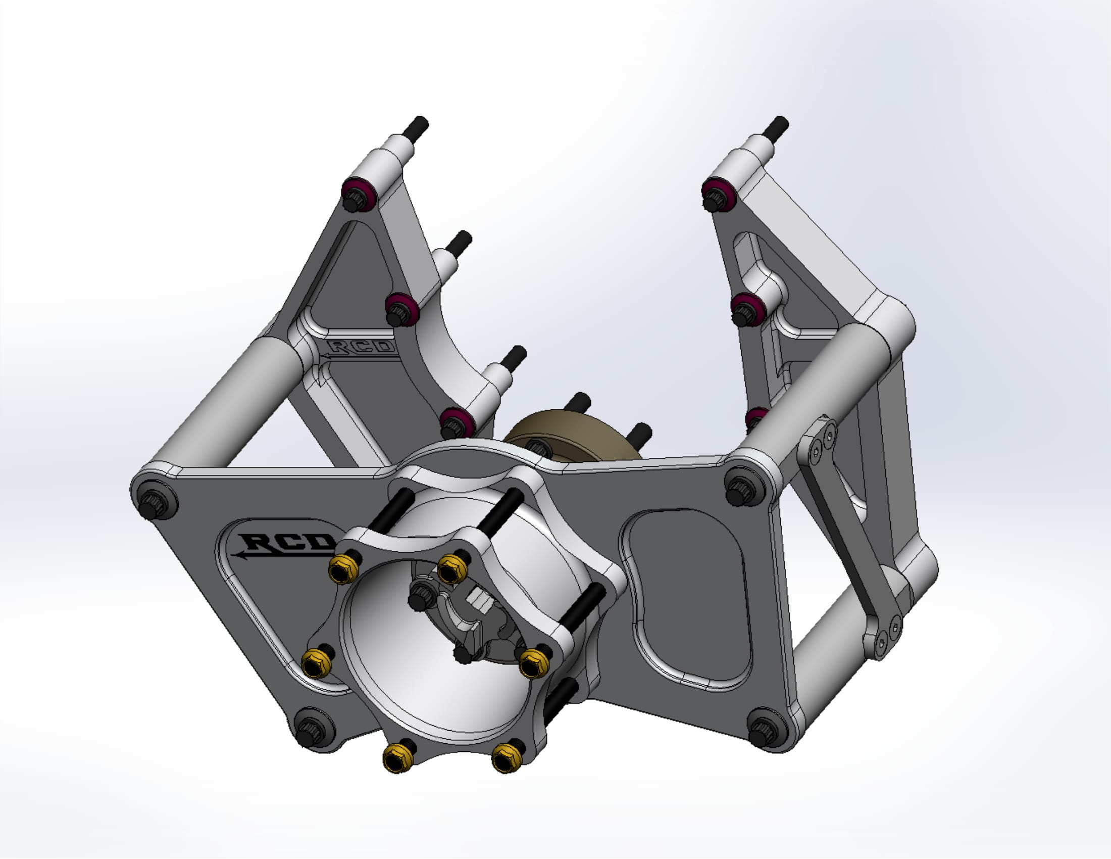 This crank support assembly is for a TFX engine block and incorporates a 6" flange crank mount starter. The struts on this assembly are setup to run crank trigger pickups.