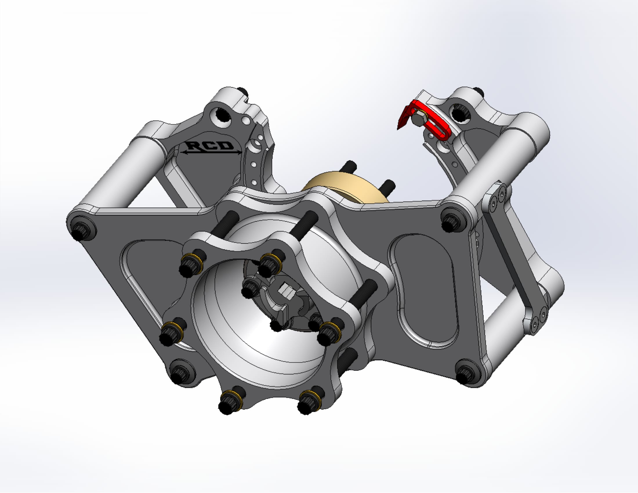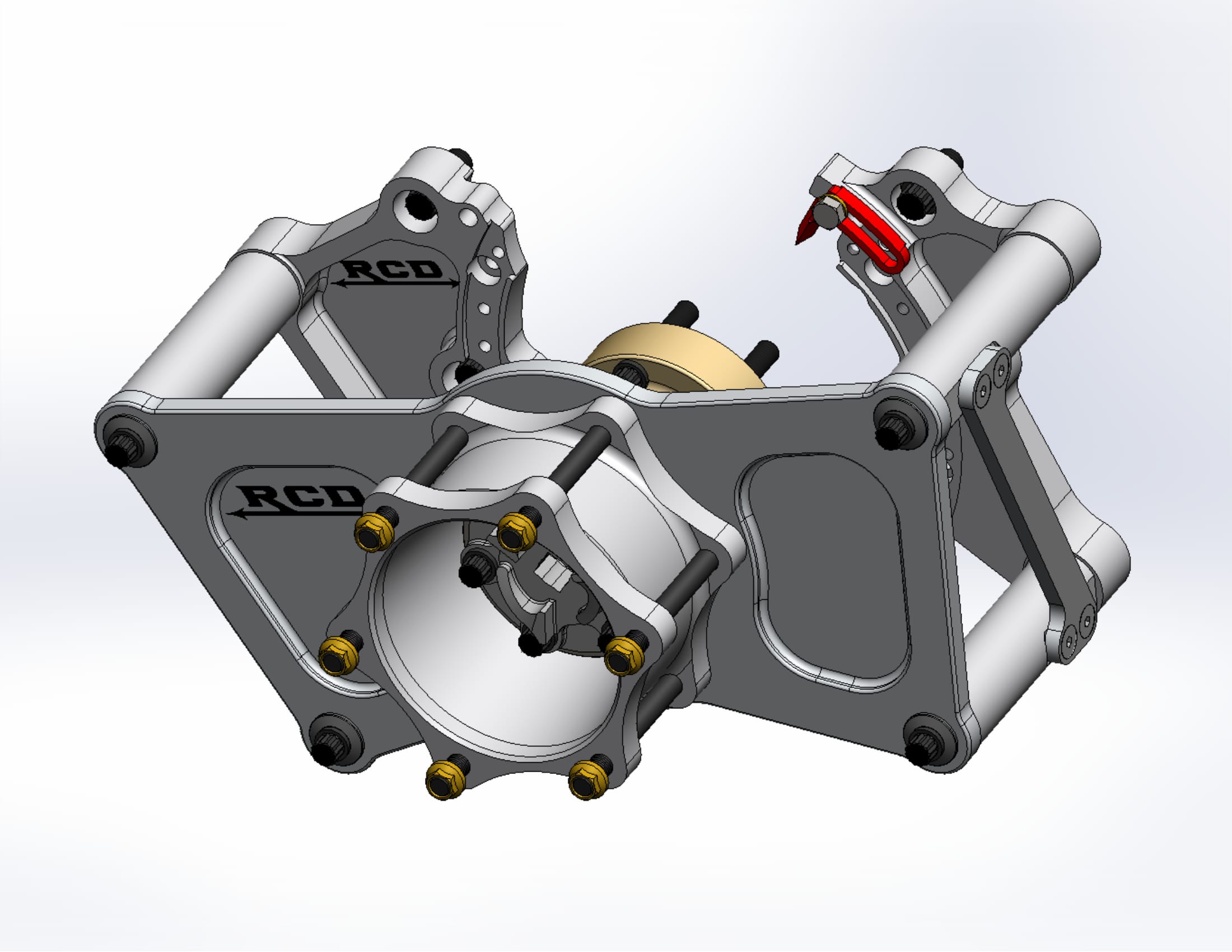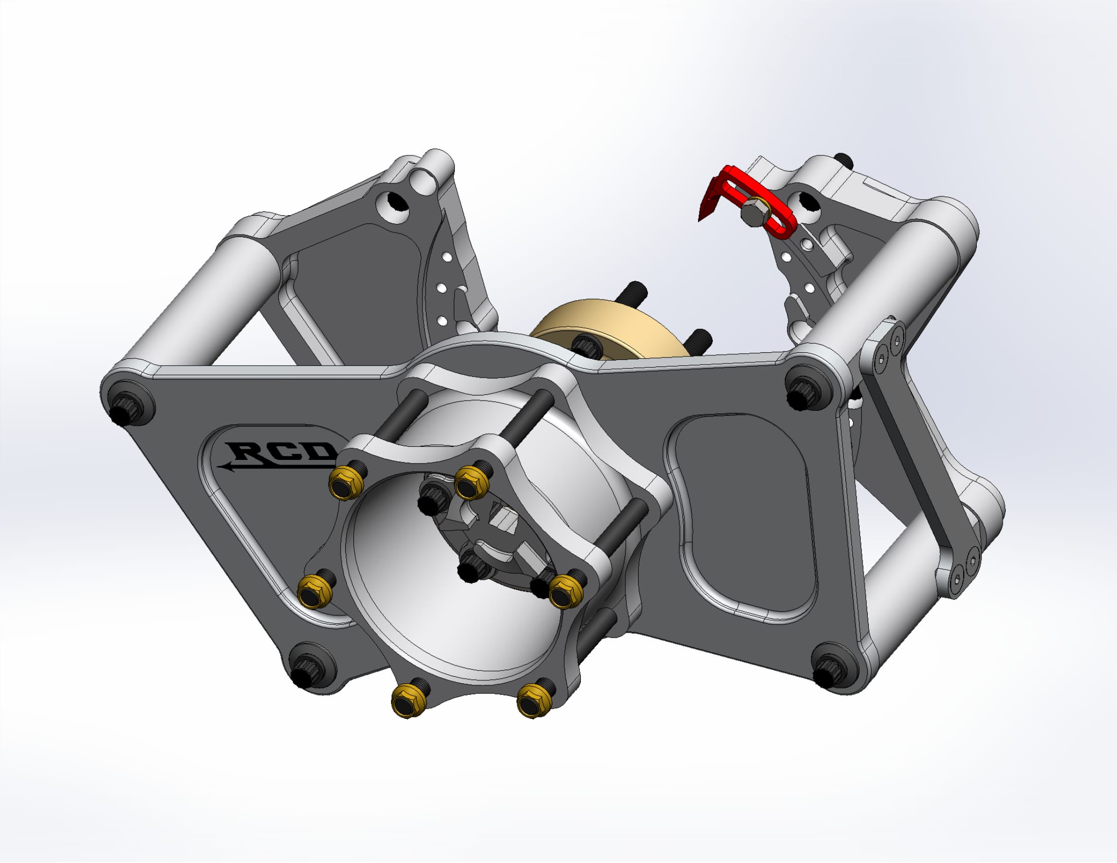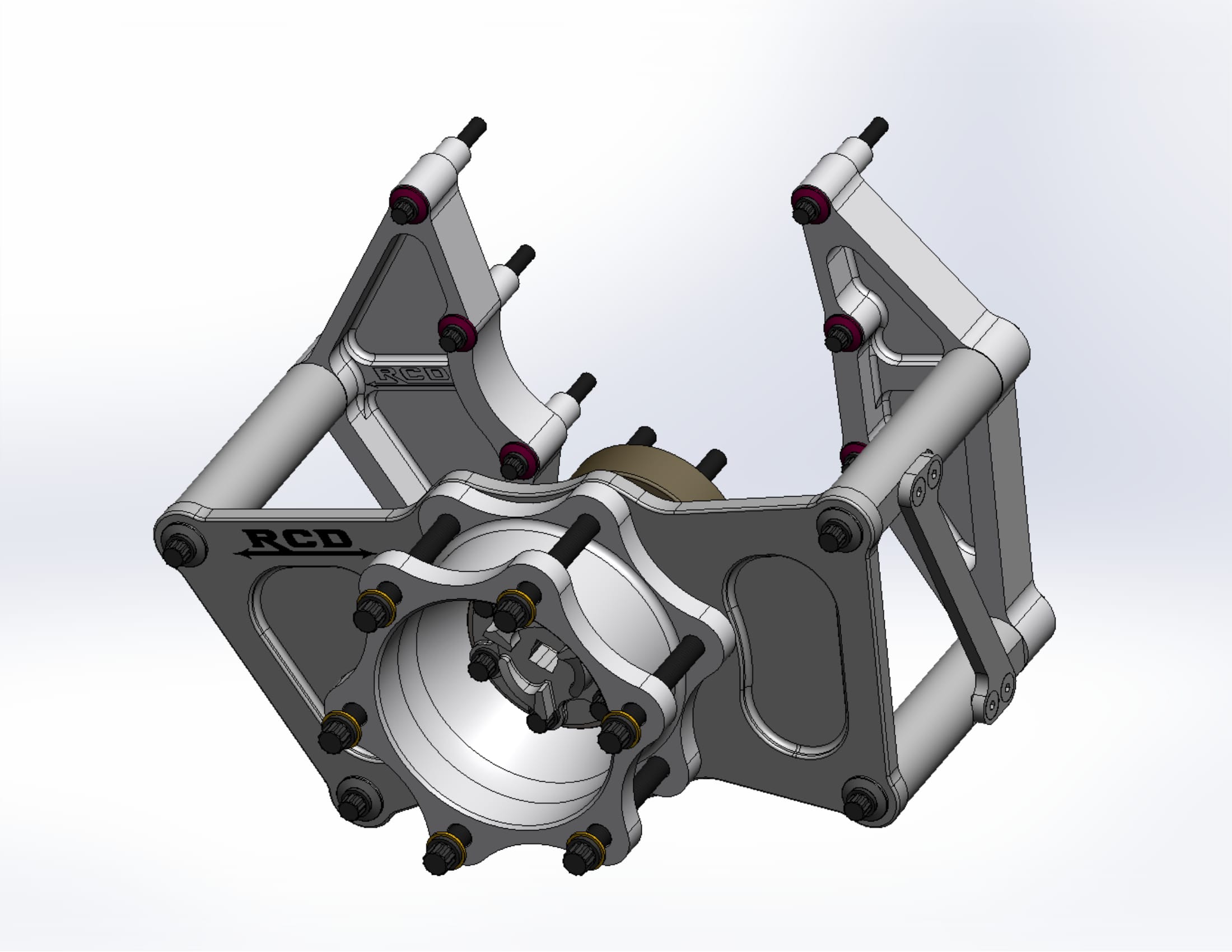 This crank support assembly is for a TFX engine block and incorporates a 6" flange crank mount starter. The struts on this assembly are setup to run crank trigger pickups.