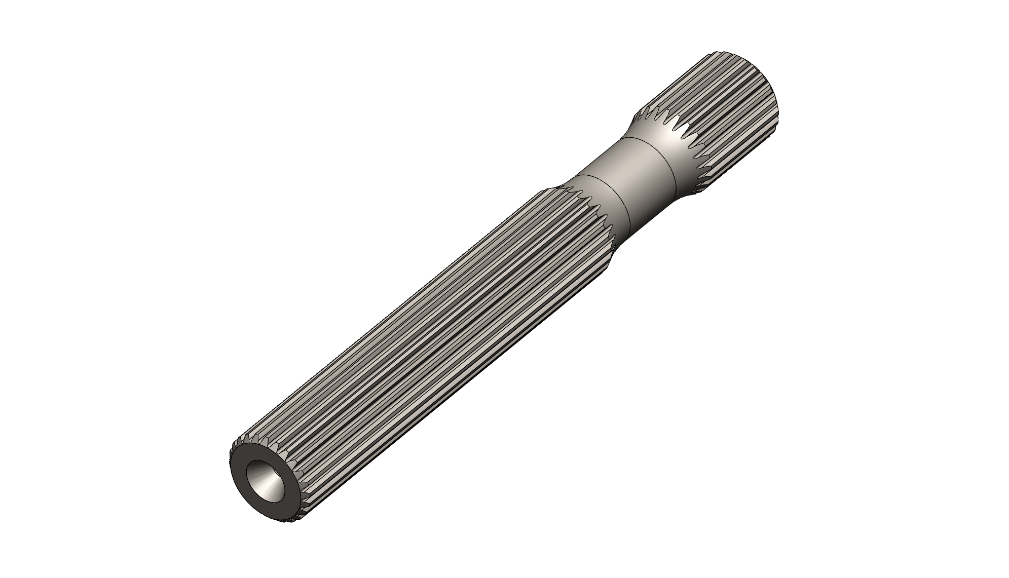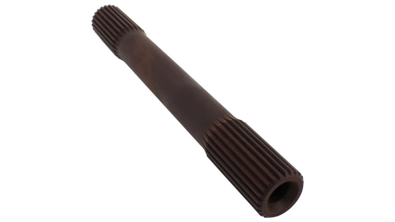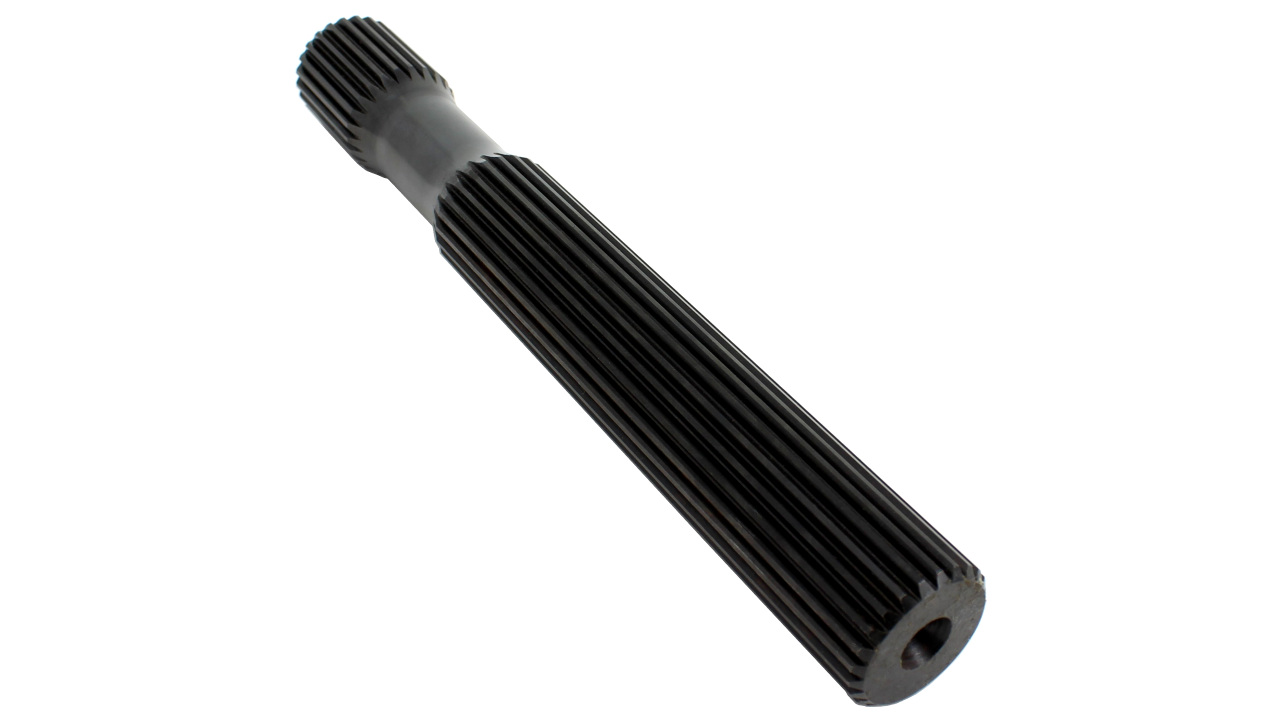 This solid drive shaft is machined from 4142 steel and is 9.50" long. The front drive hub end has 3/4-16 thread for a shaft retaining bolt. The rear drive hub end has 6" of spline and can be cut down for use with a RCD 6" or 8" blower snout.