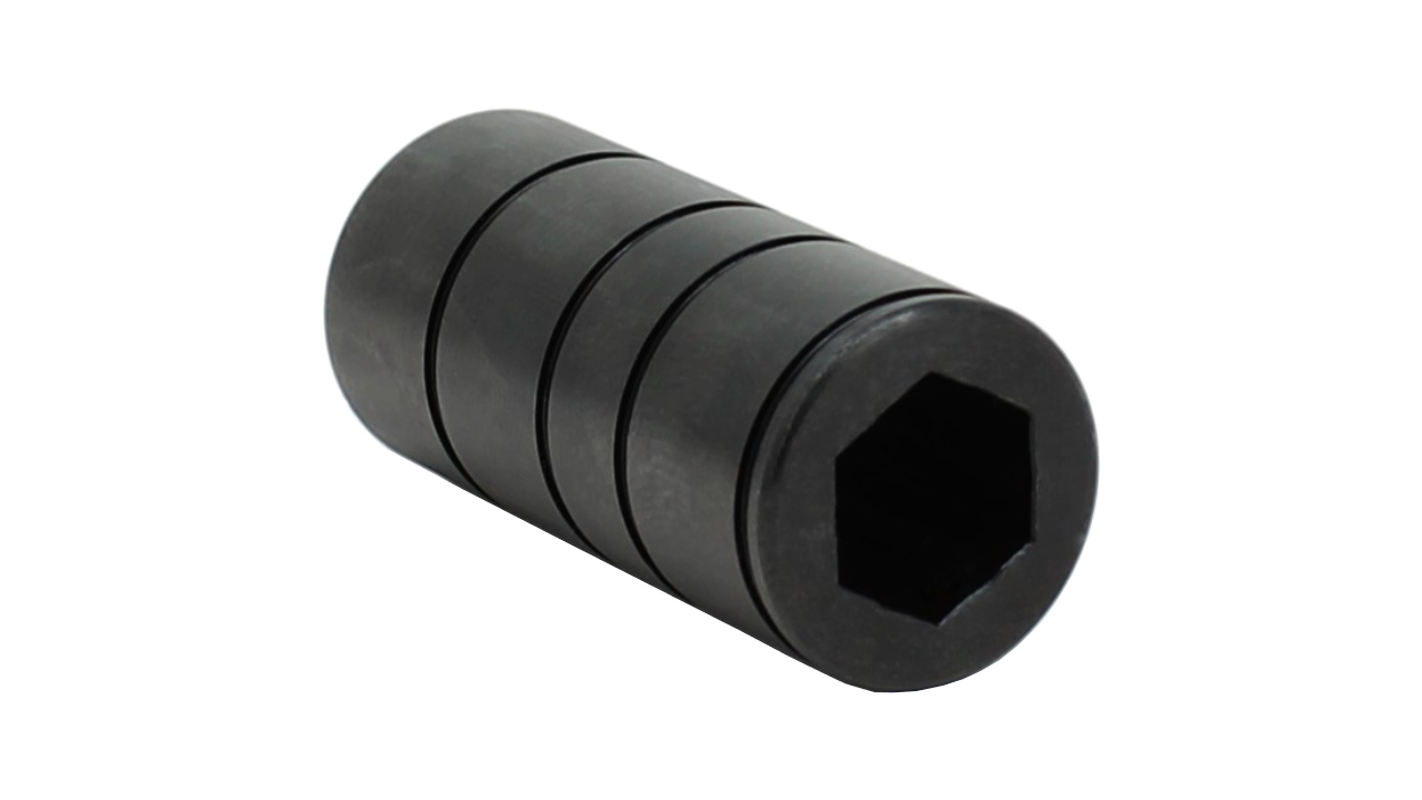 This hex adaptor adapts 5/8” male to 3/8” female with a 0.65” length.
