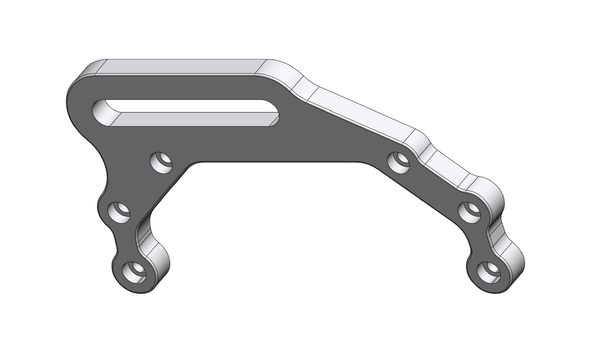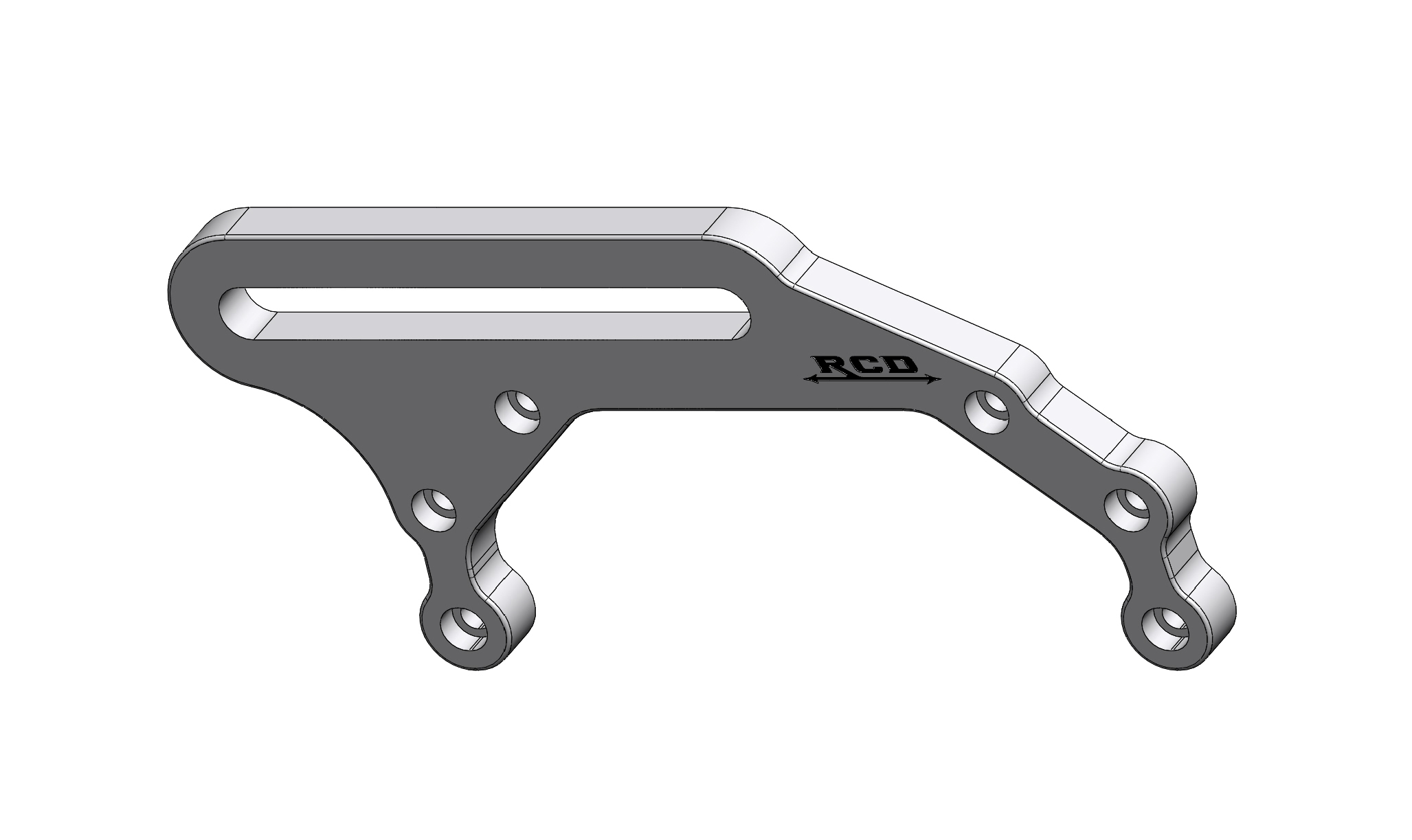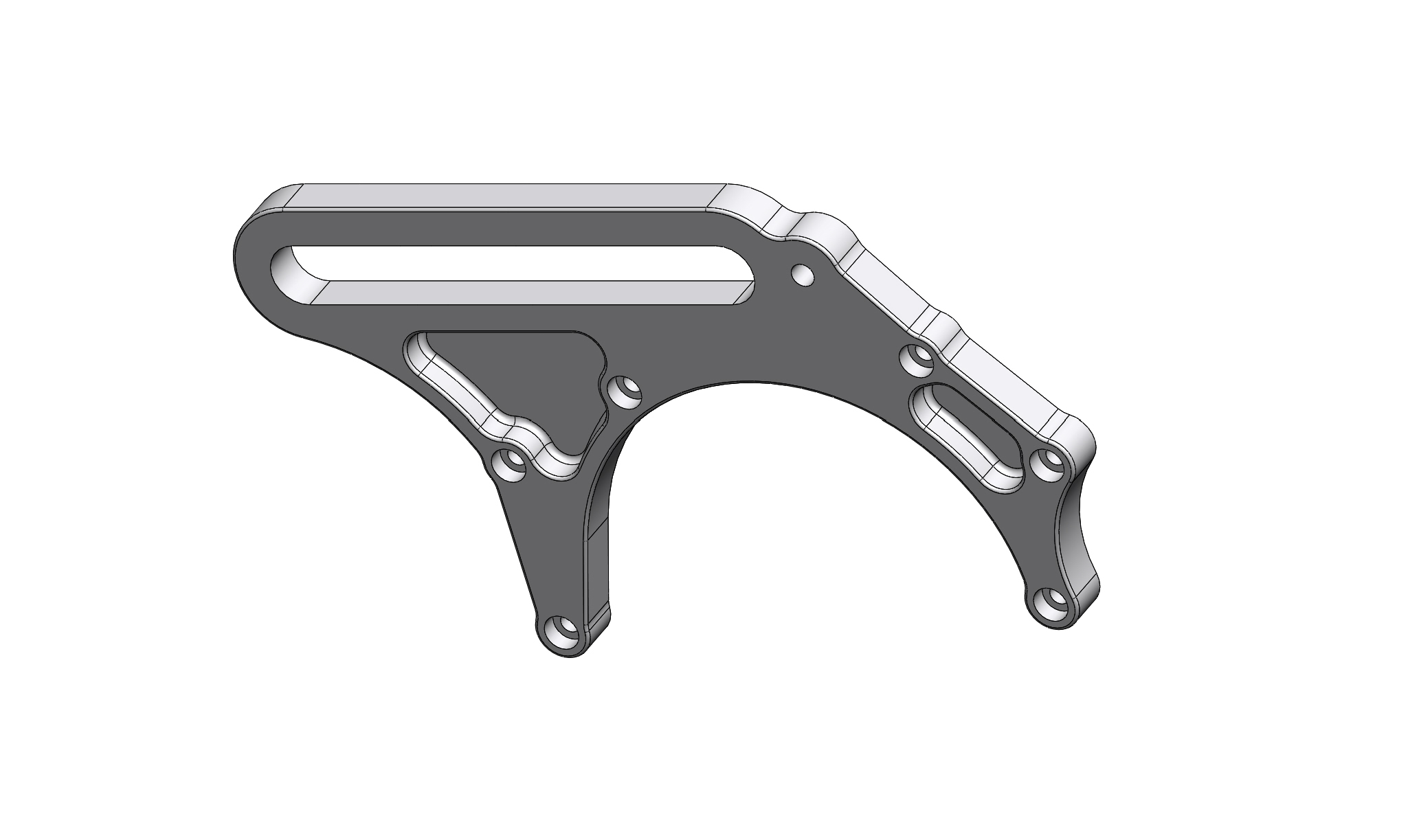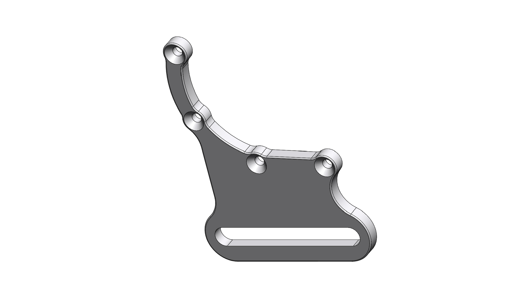 This idler plate fits a 426 BAE or TFX engine block it has an angled slot (1.01" x 8.32") and holes for an outboard support. This plate also has a 3/8-24 tapped hole in the end of the slot so that a jack screw can be added to assist in tensioning the idler pulley.