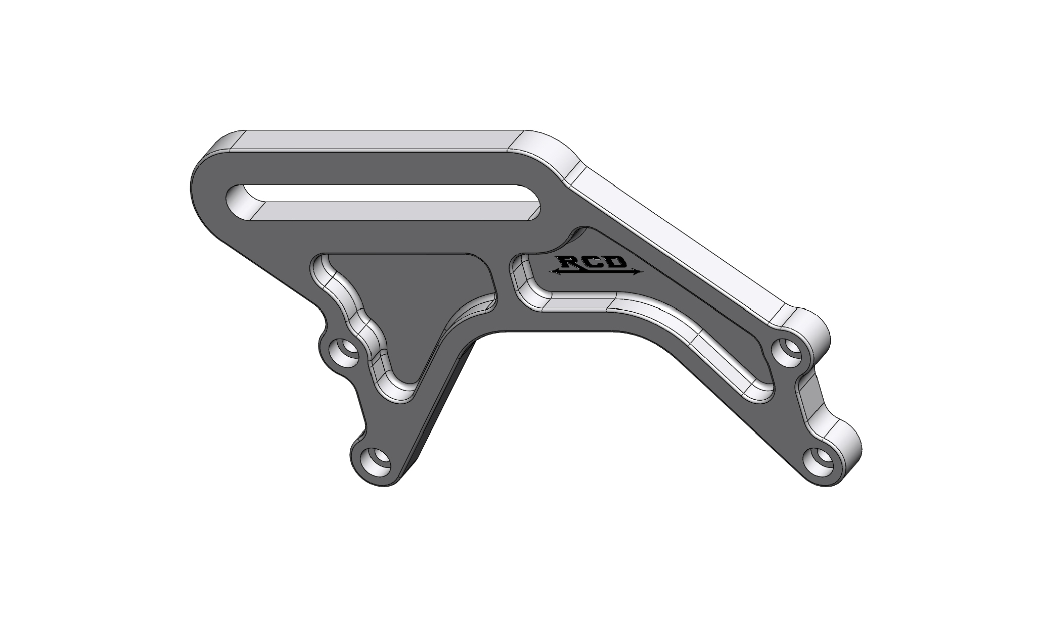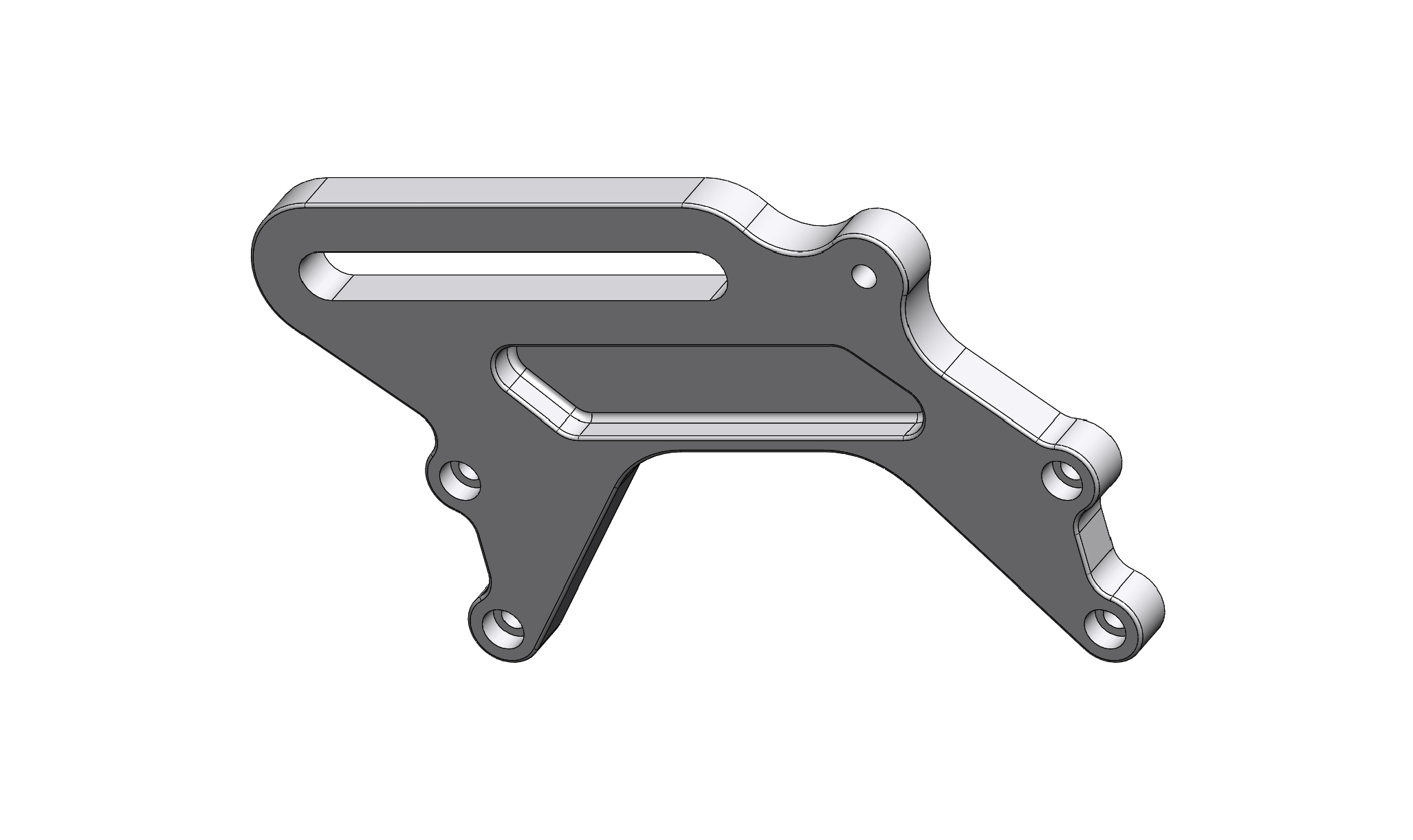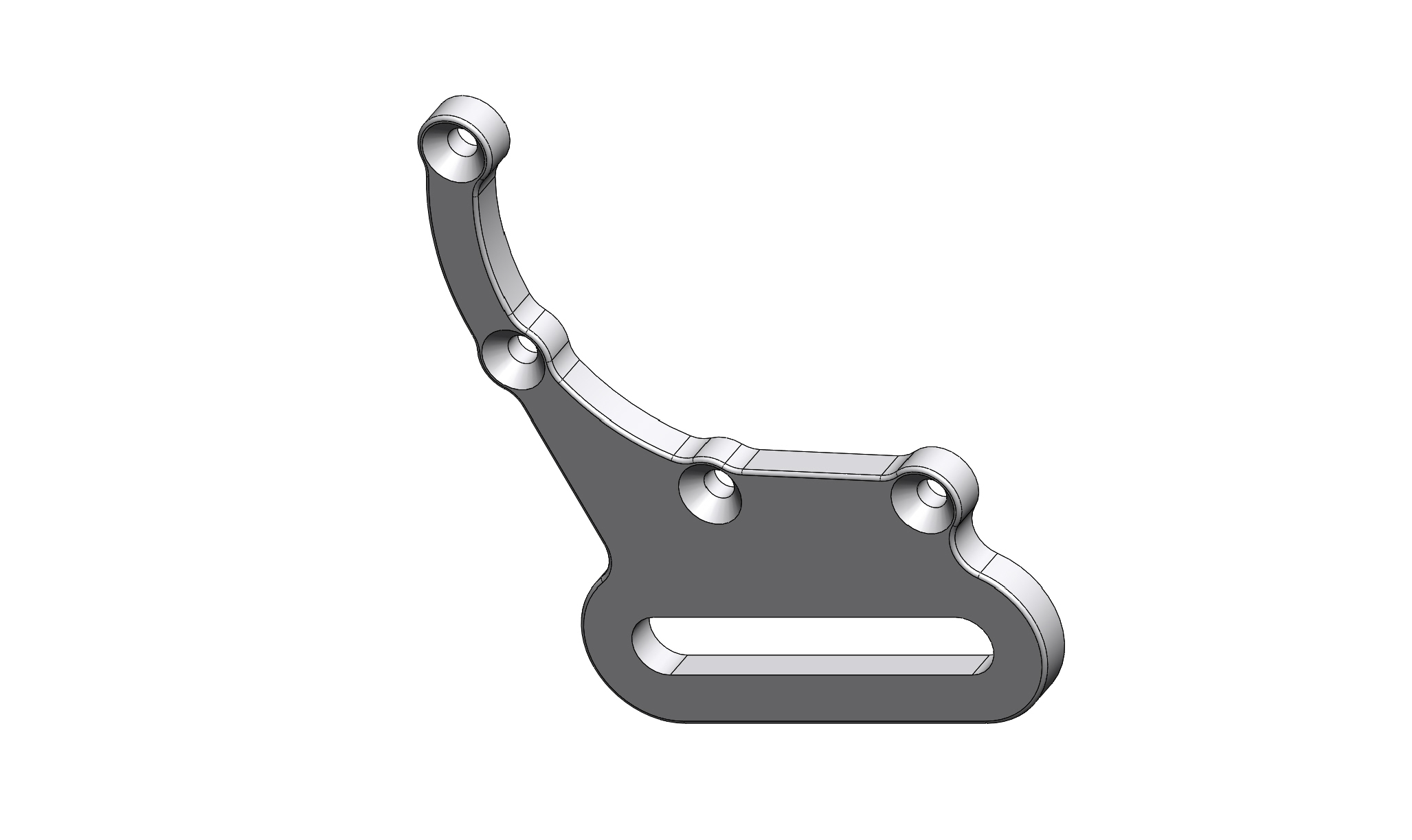 This idler plate fits a 426 BAE or TFX engine block it has an angled slot (1.01" x 8.32") and holes for an outboard support. This plate also has a 3/8-24 tapped hole in the end of the slot so that a jack screw can be added to assist in tensioning the idler pulley.