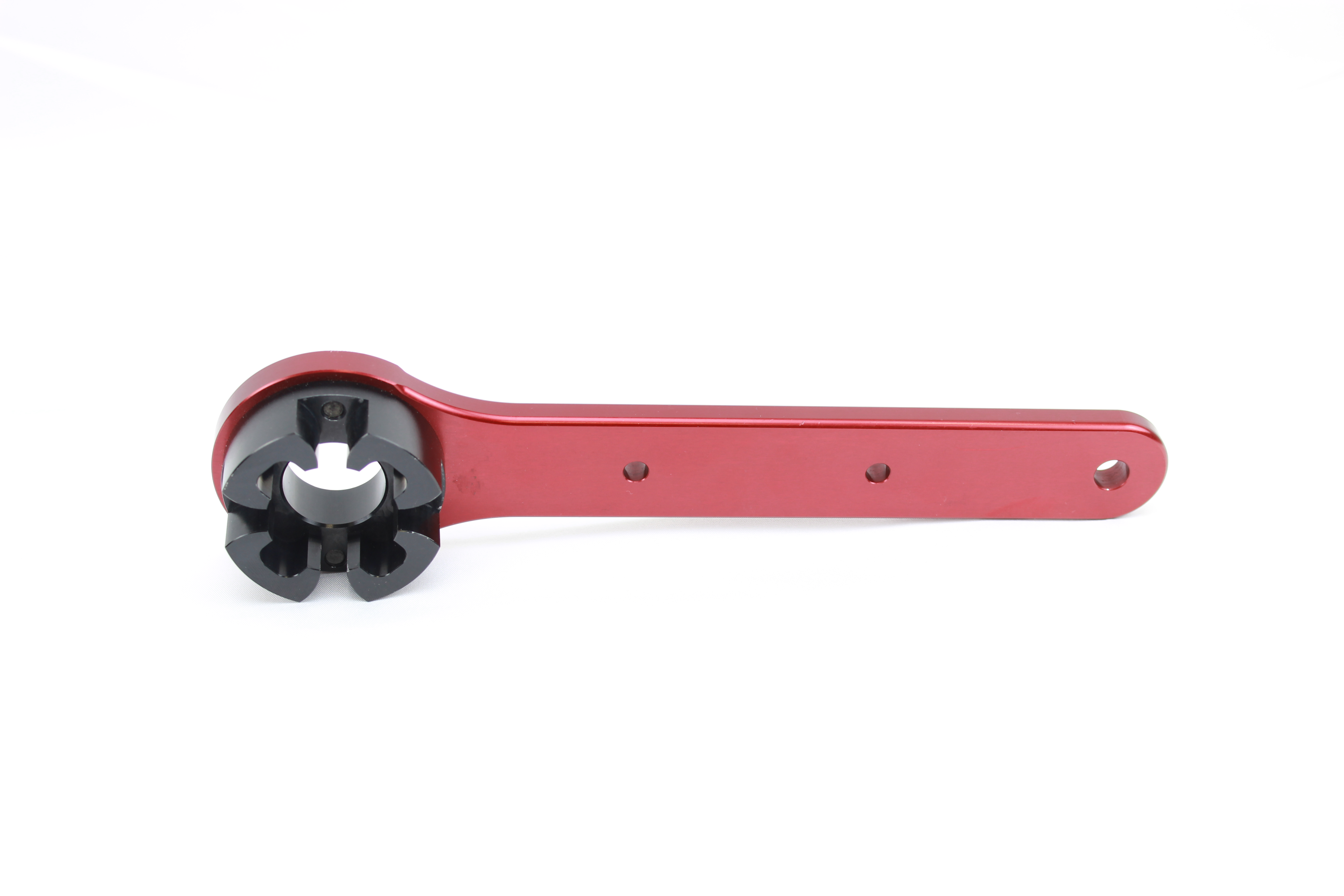 This wrench is designed to fit the MSD cross drive and RCD's rotex coupler drive. This tool allows you the hold the coupler for easy nut removal without removing the cap to hold the rotor. Machined from aluminum with a red and black anodized finish.