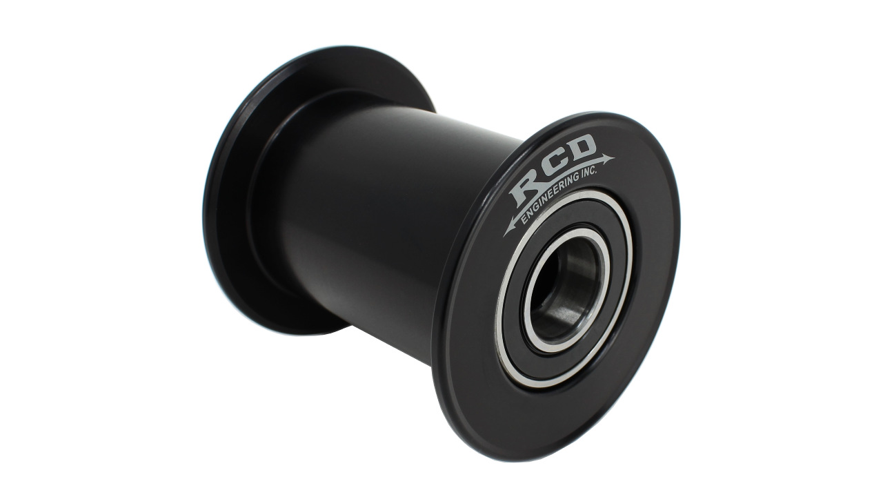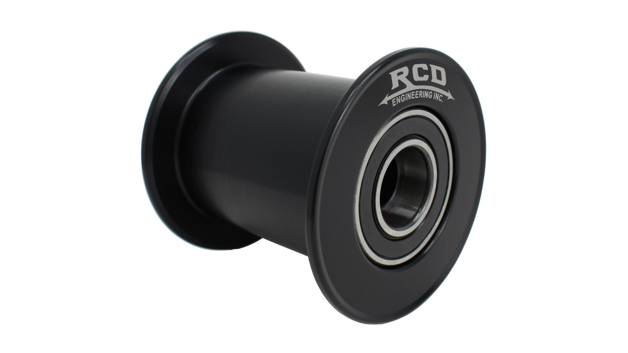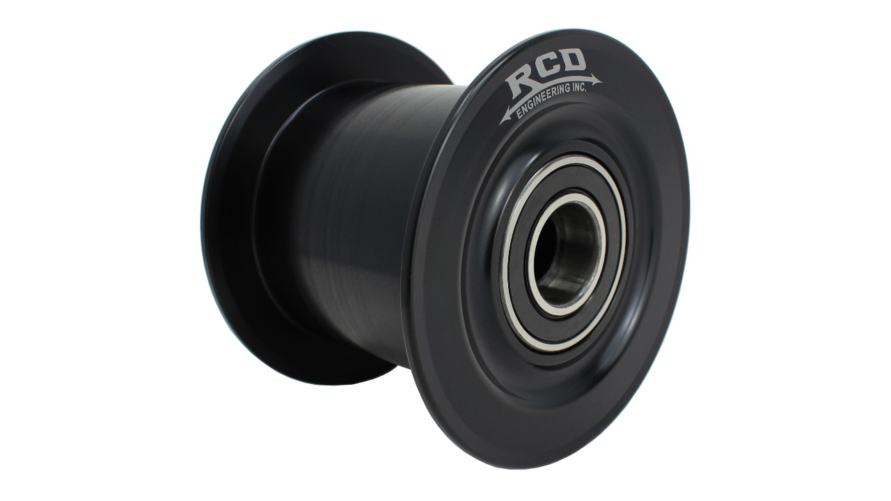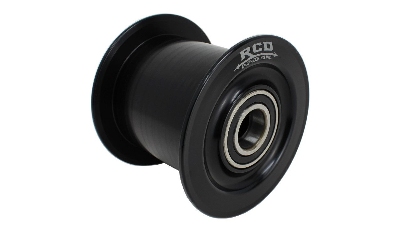RCD idler pulleys are machined from a single piece of billet aluminum with a large inner cavity for weight reduction. These pulleys have high speed bearings pressed in over a steel inner spool. Diameter measurements do not include flanges, width measurements are inside flanges.