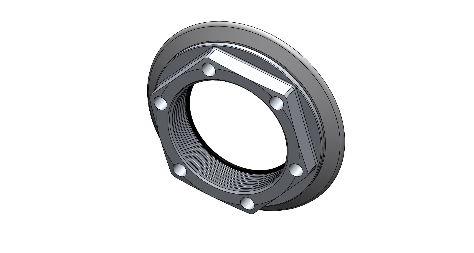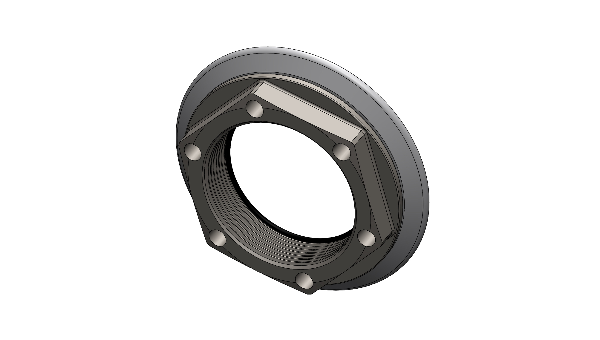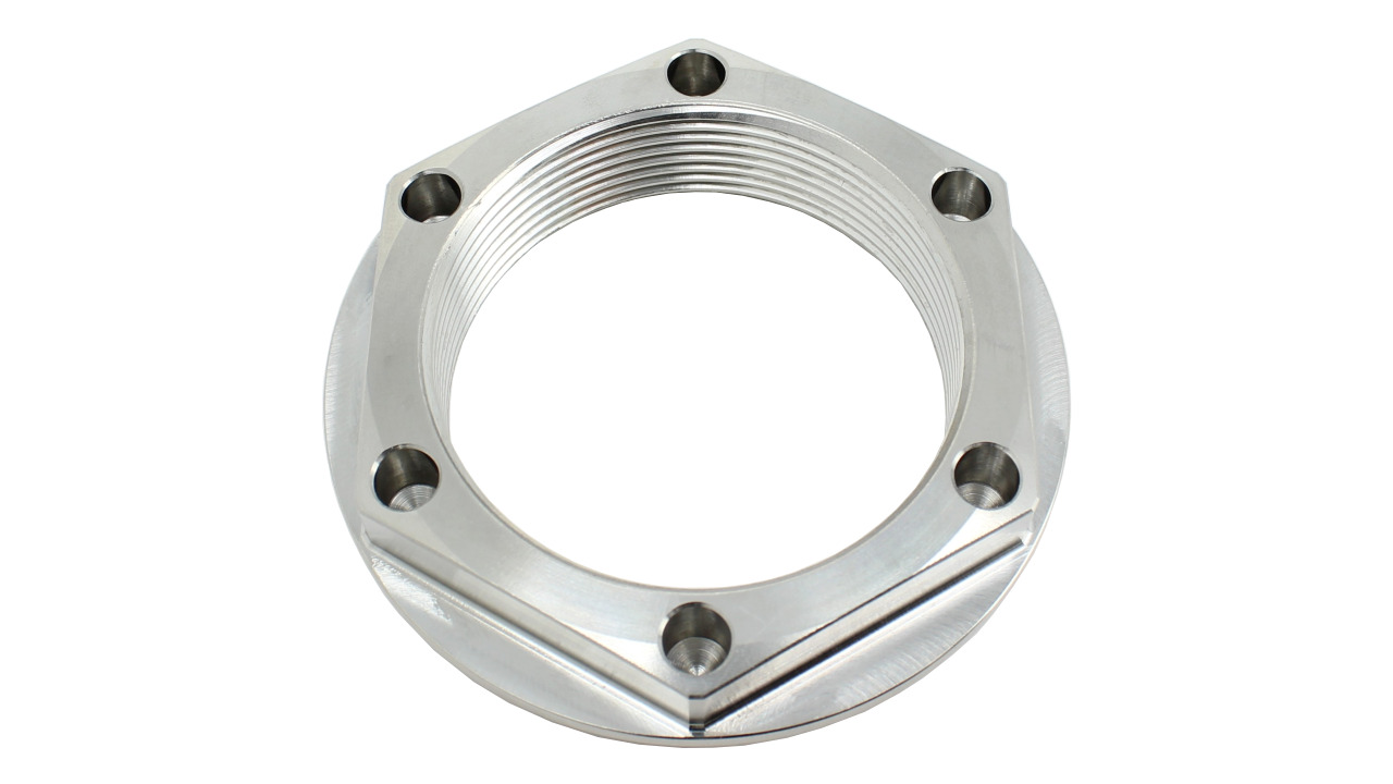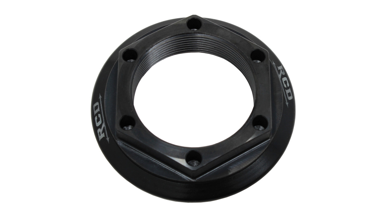 RCD sprocket retaining nuts are made to work in conjunction with RCD threaded hubs providing a secure clamp for the blower pulley and degree ring. Retaining nuts consist of a steel or titanium core with a left-hand thread and a free spinning cupped aluminum washer. These parts are machined with a 2.75" hex and six evenly spaced holes for a spanner wrench, RCD offers a hex socket (PN# 450520-05) made to tighten this nut.