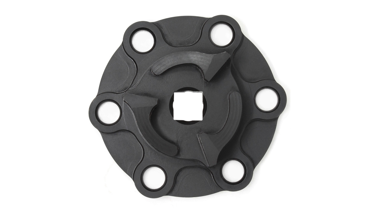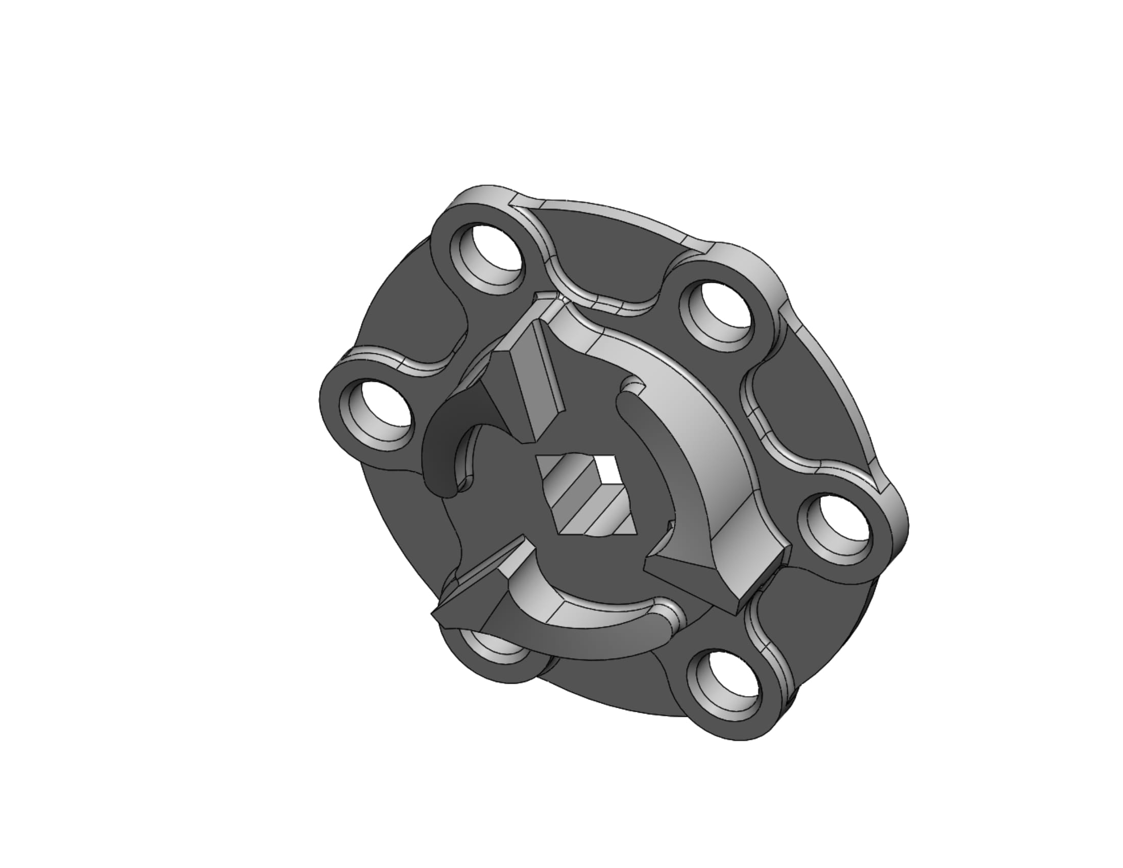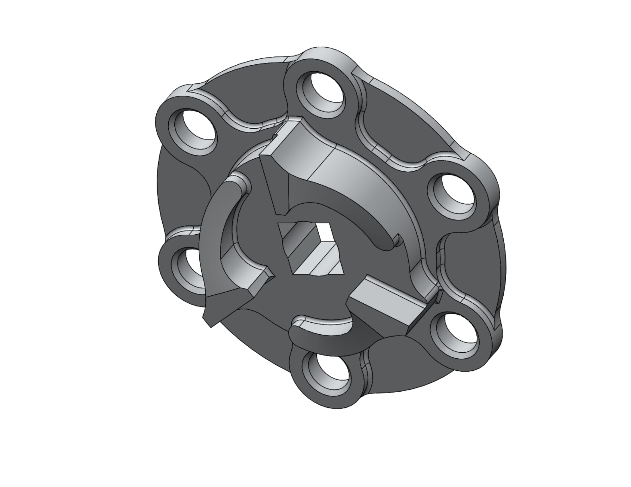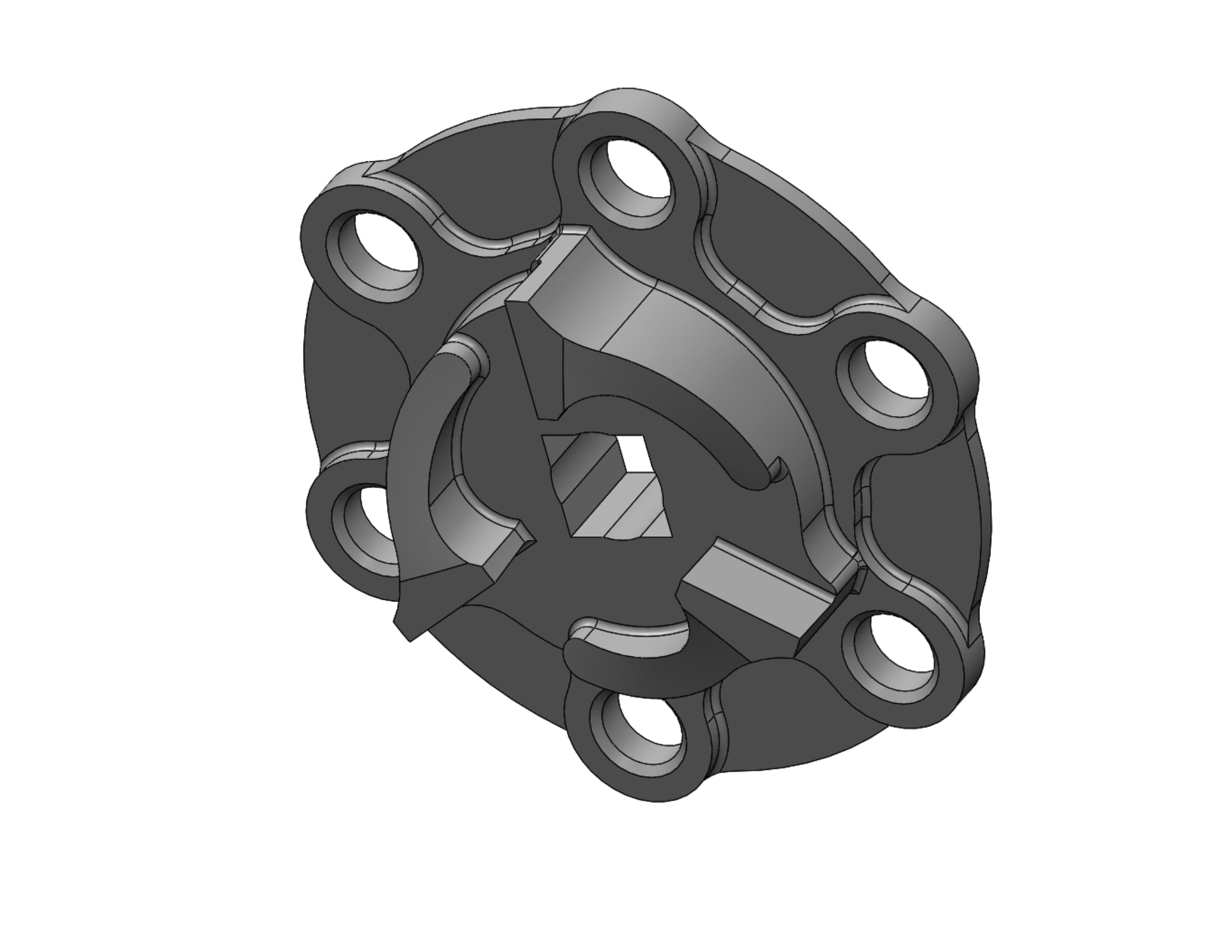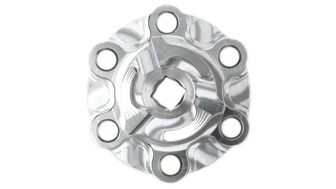 This standard 6 hole engine jaw has standard rotation and has been modified to work with a fixed or removeable crank mount starter on an application using a splined crankshaft and crank hub.