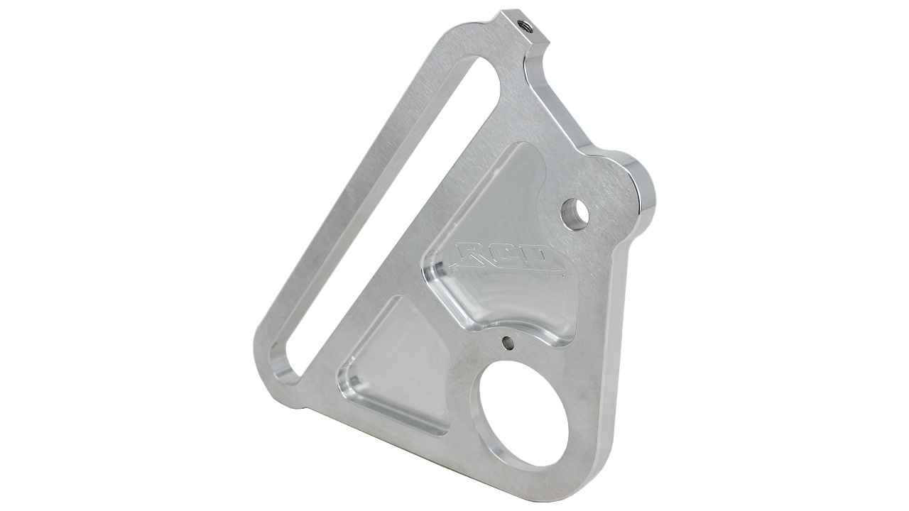 This outboard support plate attaches to the angled idler plate PN: 156206-01 and a threaded pump extension PN: 300201-0076. Made from 1/2" aluminum plate this brace also has provisions for a jack screw and a mount for an anti-rotation tab for a Rage fuel pump.